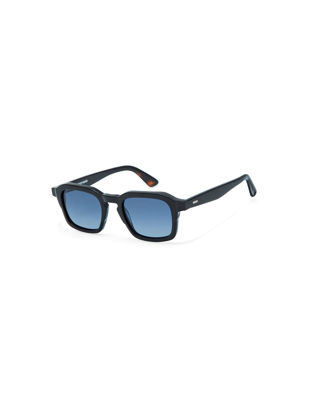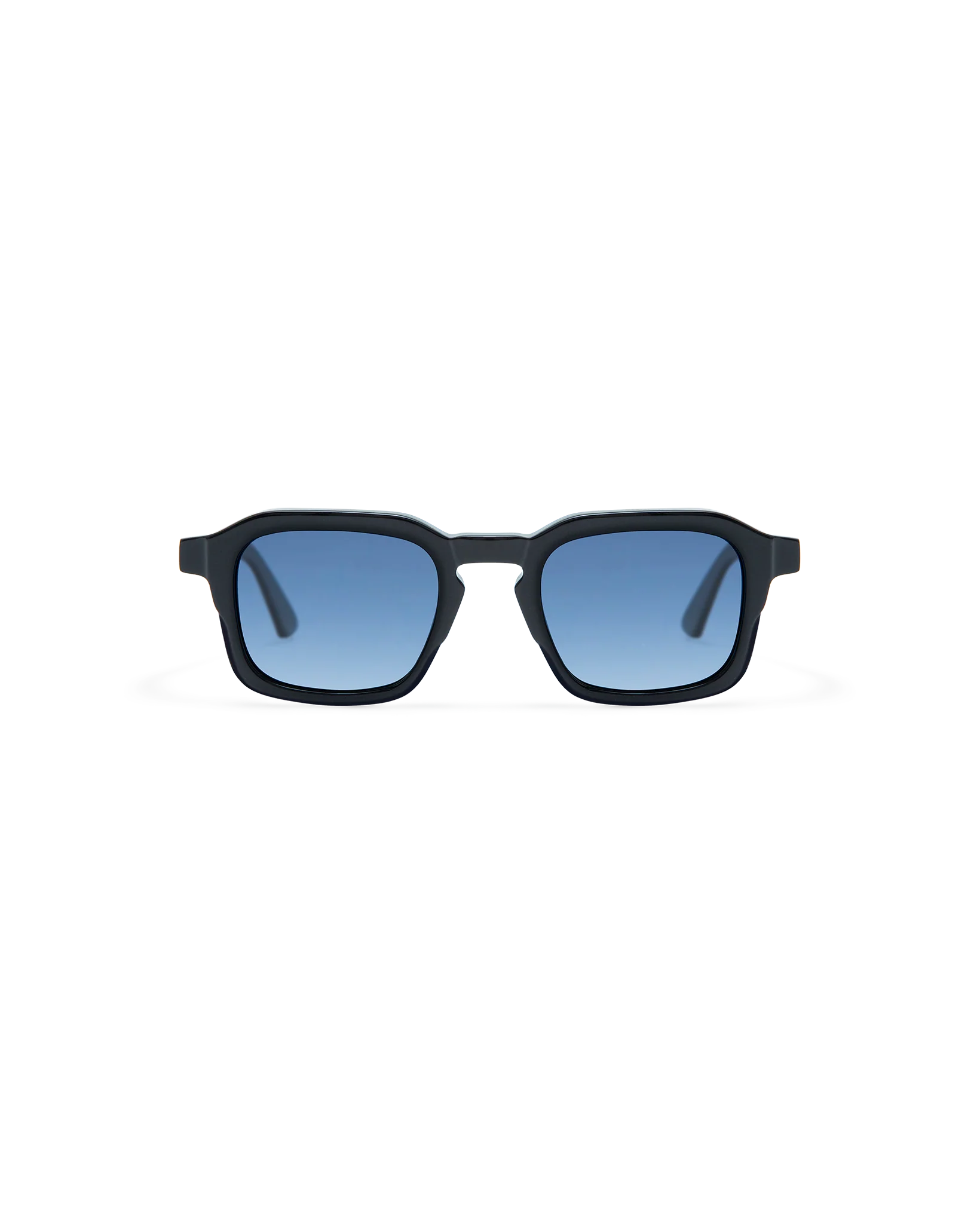 gafa de sol cuadrada de pasta negra con lentes azules claras