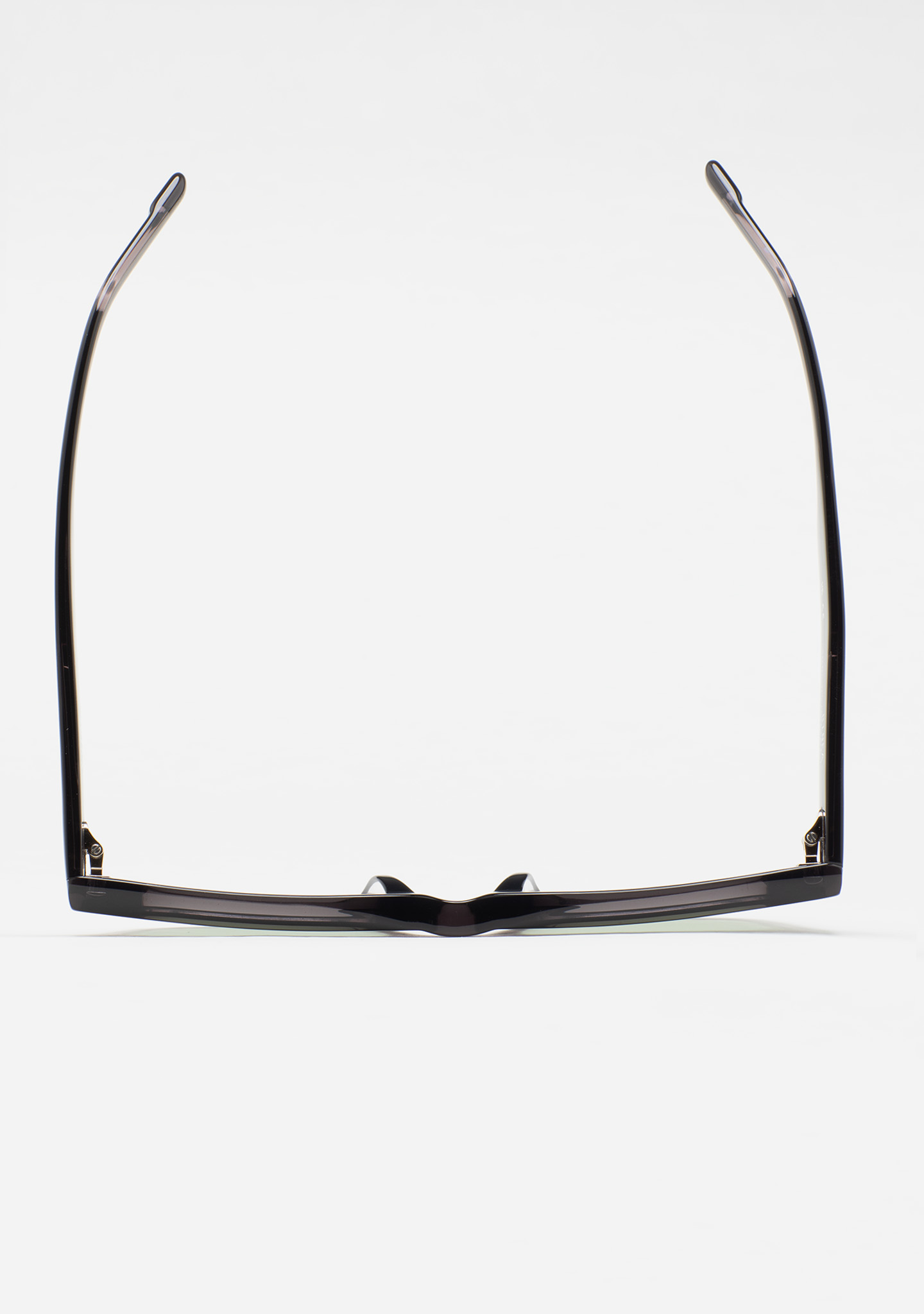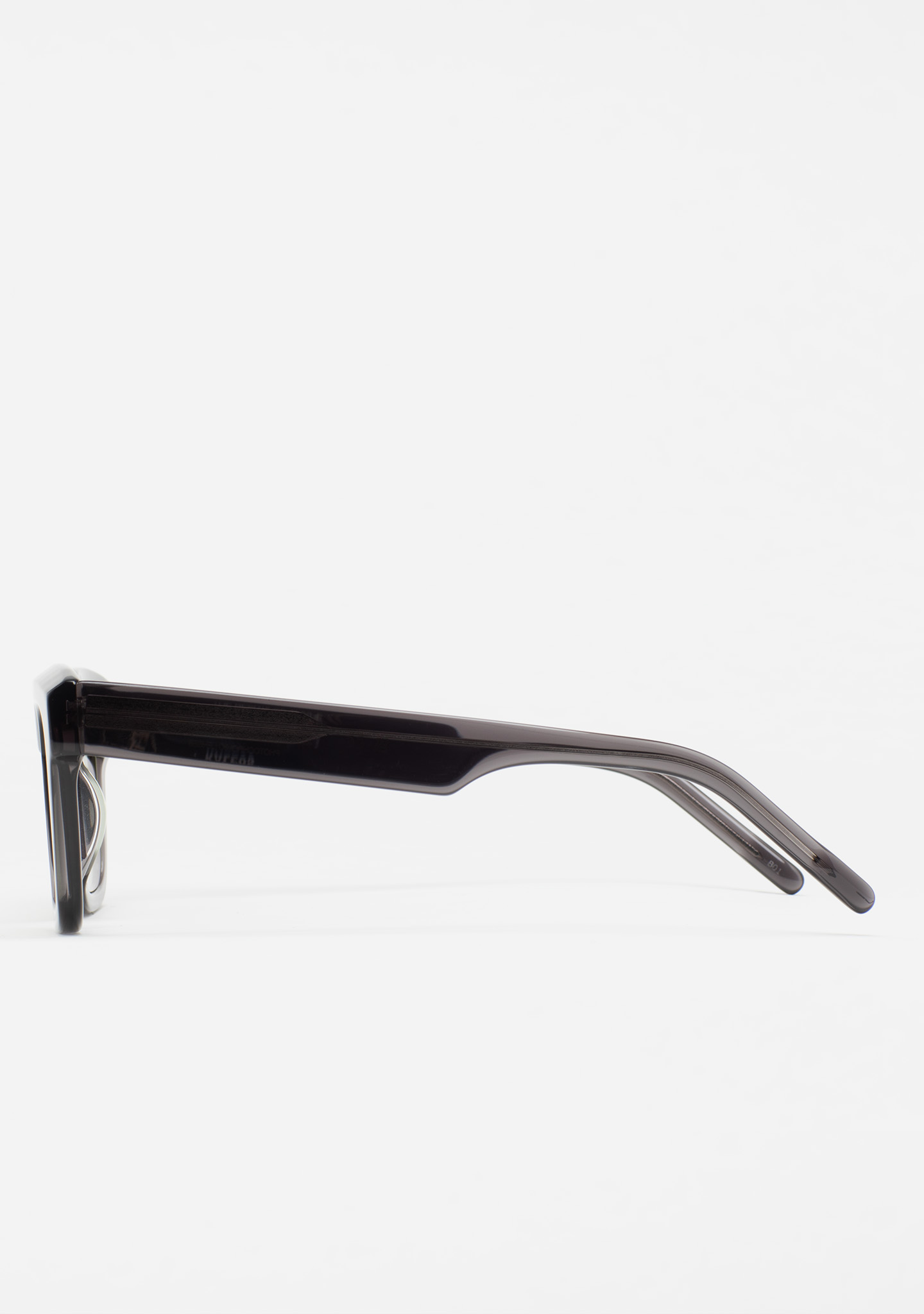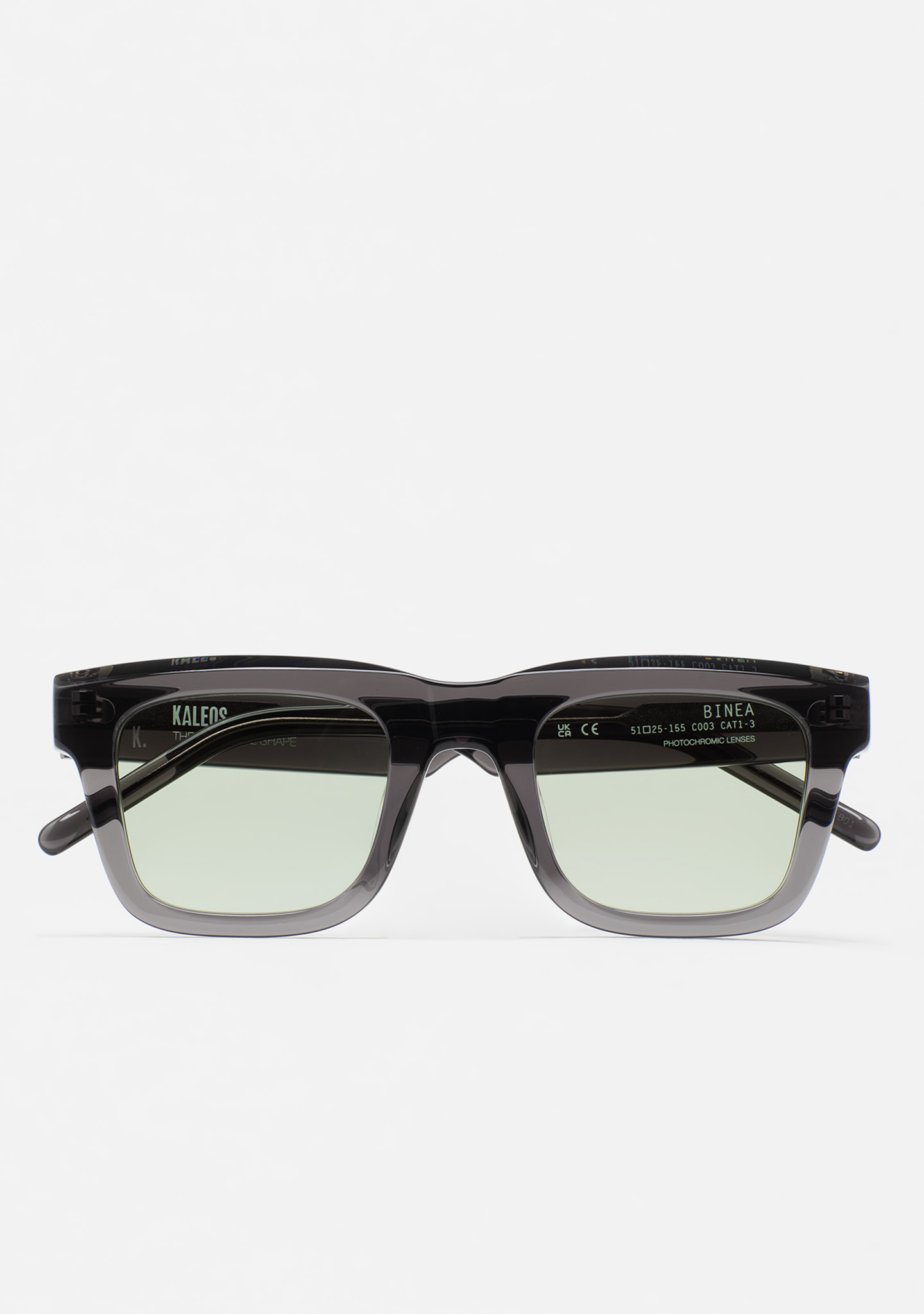 Modelo BINEA. Gafa de sol de forma cuadrada con fresado en la ceja. Frontal de acetato grueso gris oscuro transparente con fresado en la parte superior. Varillas de acetato gris oscuro transparente. Lente verde fotocromática base 2 con protección UV y tratamiento antirreflejante. Lente Categoría 1-3. Plaquetas de acetato incorporadas. Hecha a mano.