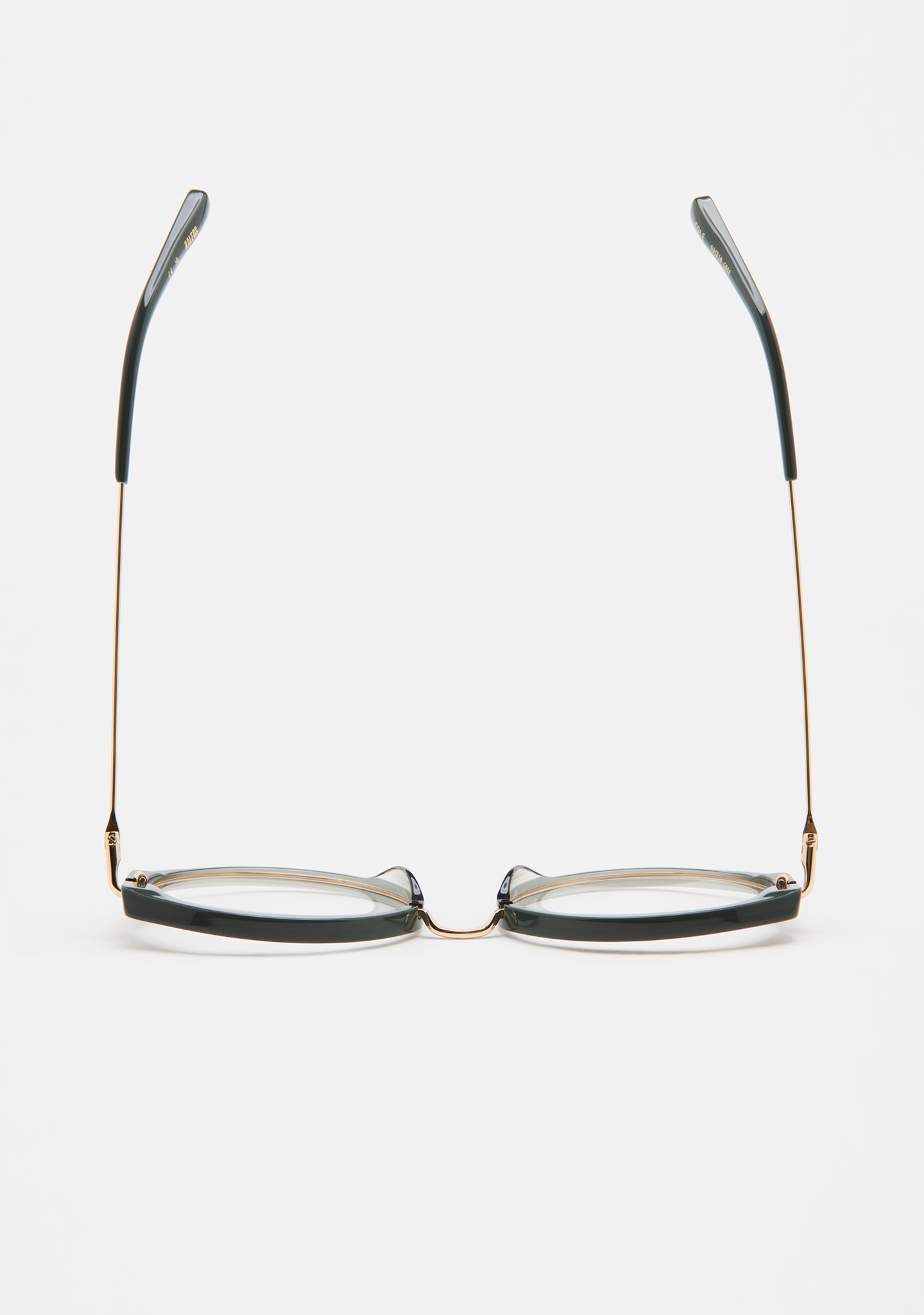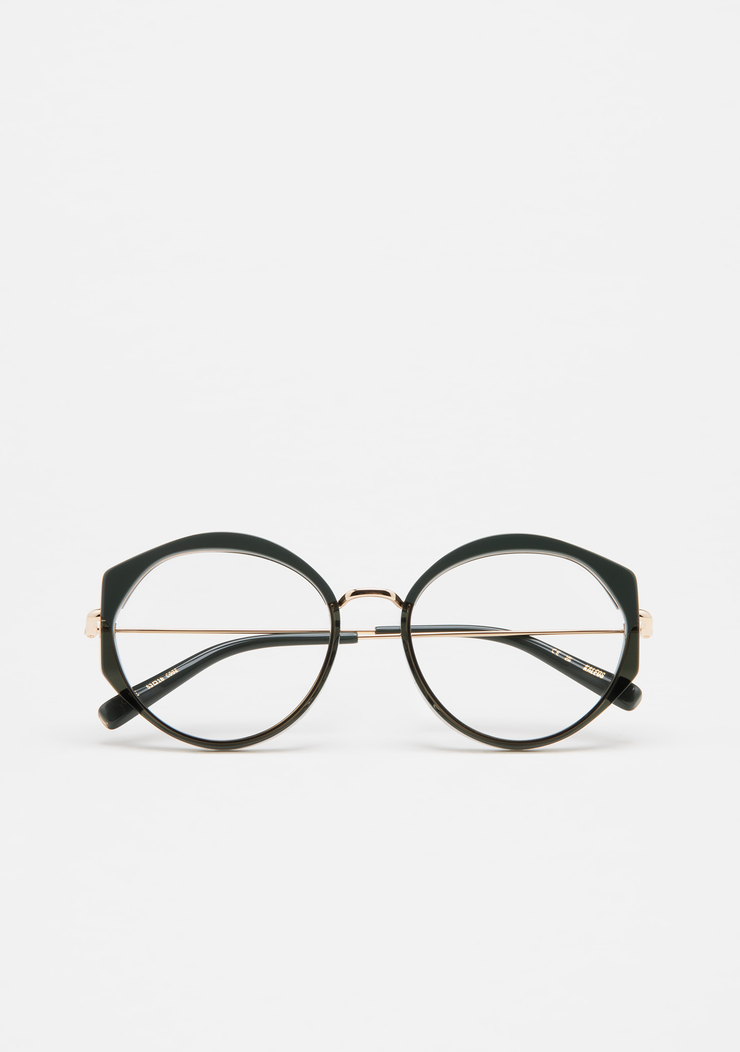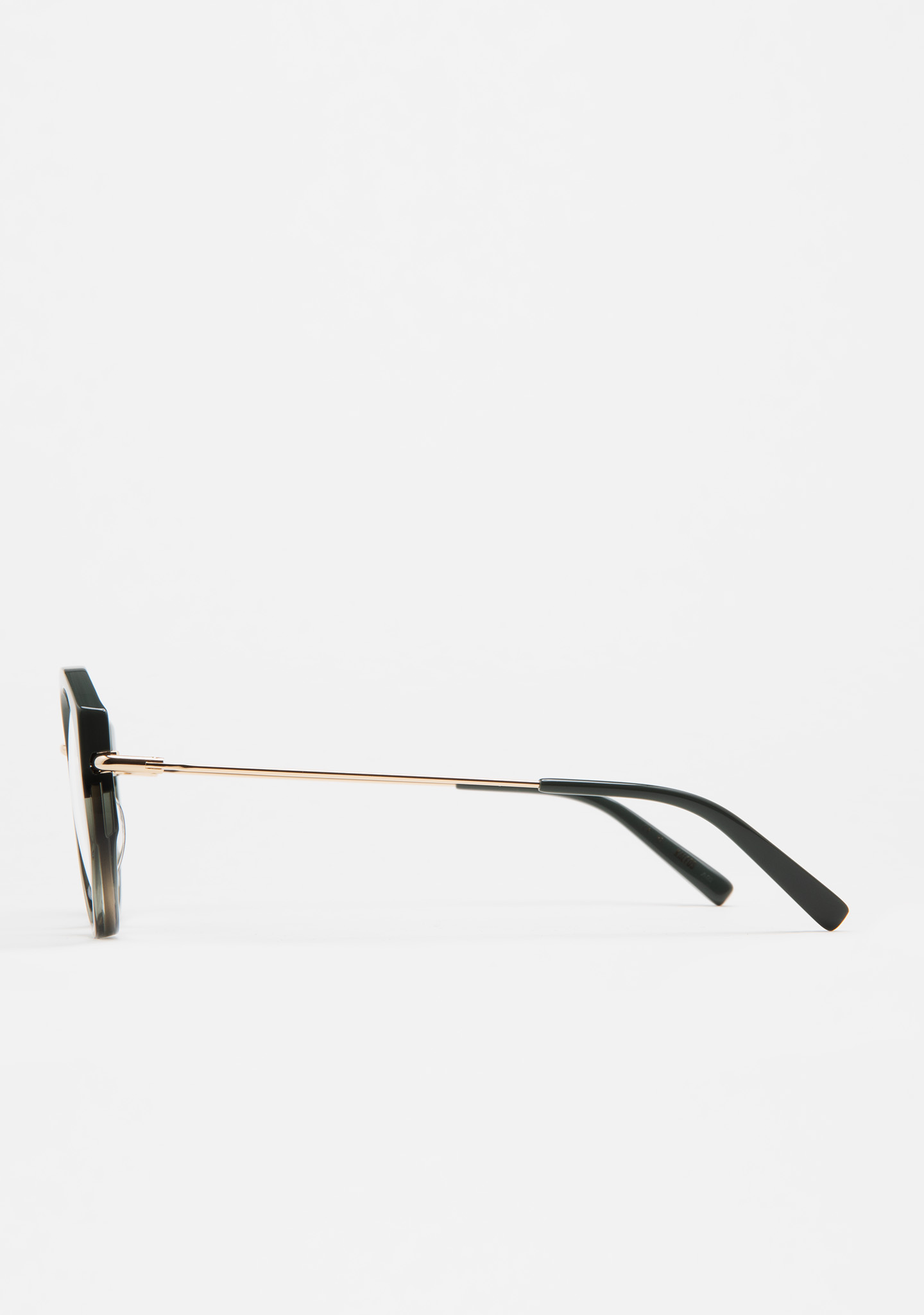 Modelo COLE. Gafa de ver de forma redondeada. Frontal de acetato negro con laminado havana marrón. Puente y varillas de acero inoxidable dorado. Varillas con terminal de acetato negro. Plaquetas de acetato incorporadas. Hecha a mano.