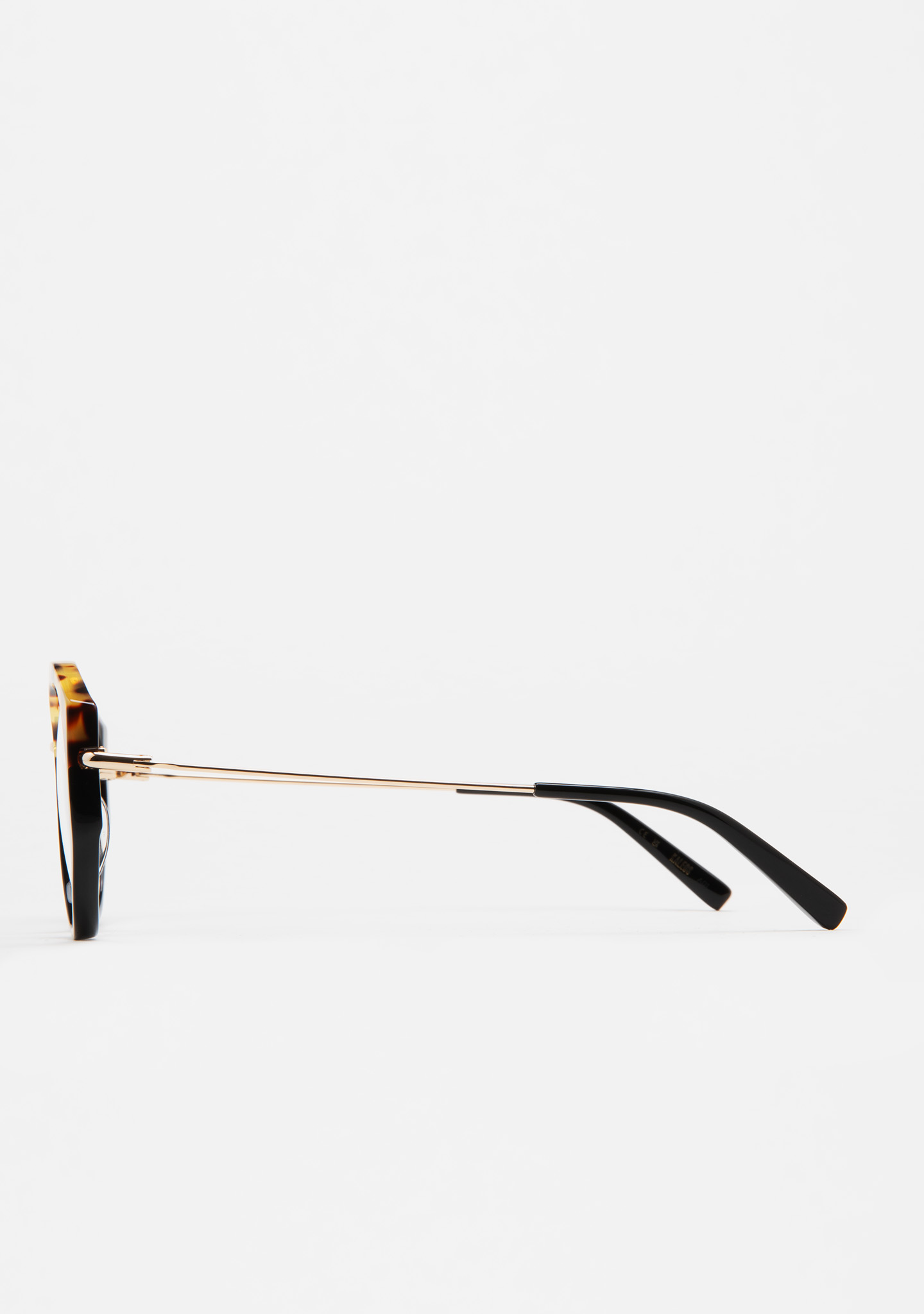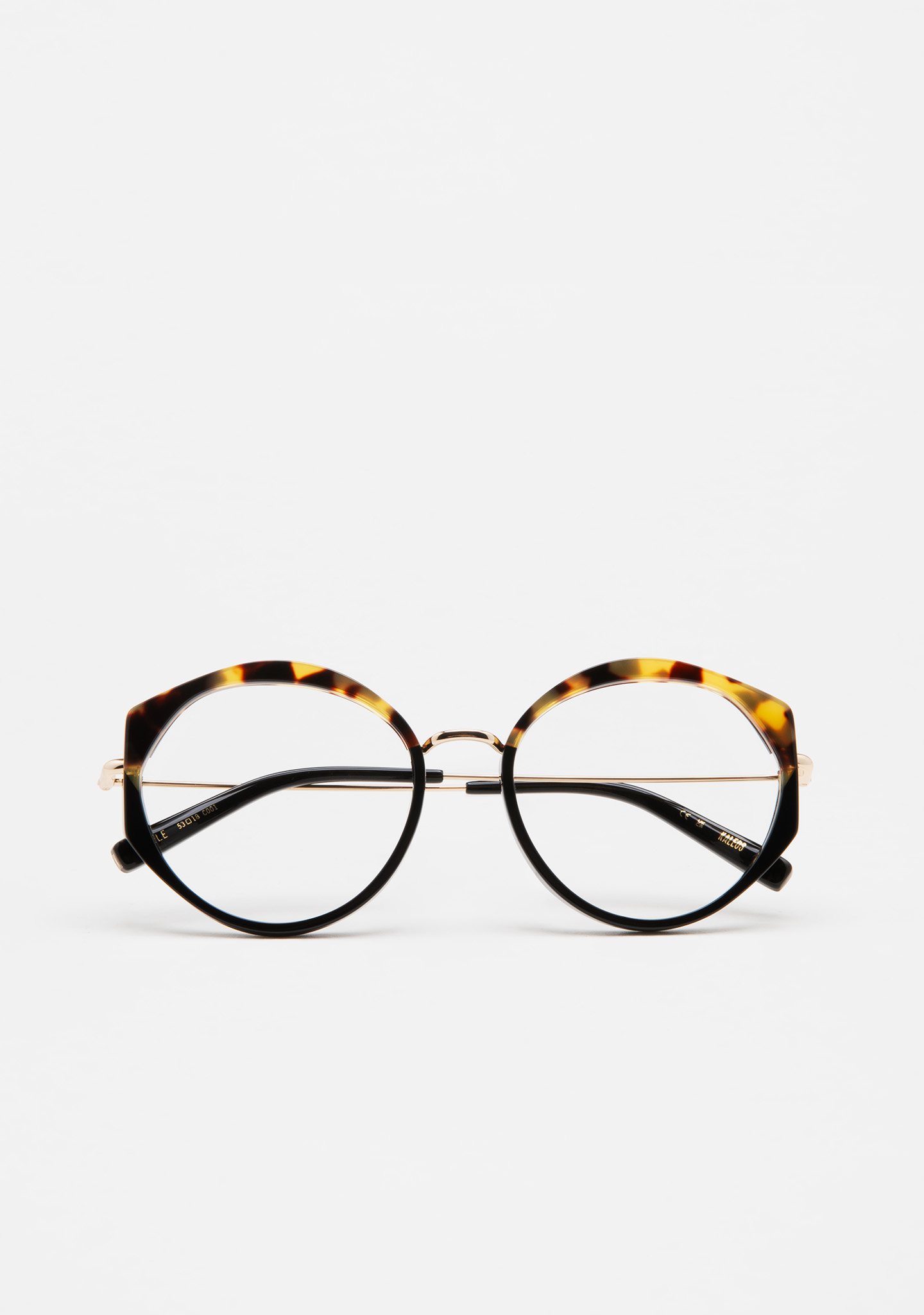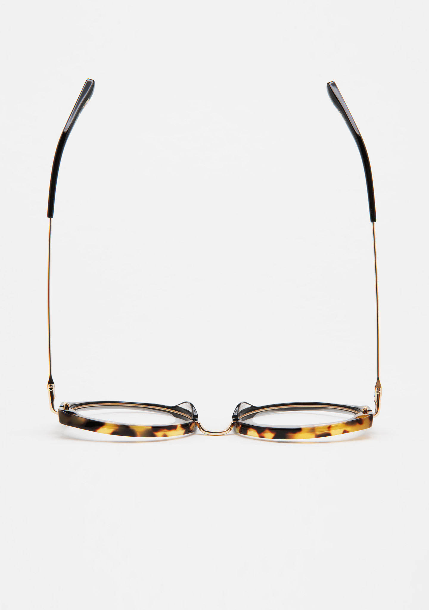 Modelo COLE. Gafa de ver de forma redondeada. Frontal de acetato negro con laminado havana marrón. Puente y varillas de acero inoxidable dorado. Varillas con terminal de acetato negro. Plaquetas de acetato incorporadas. Hecha a mano.