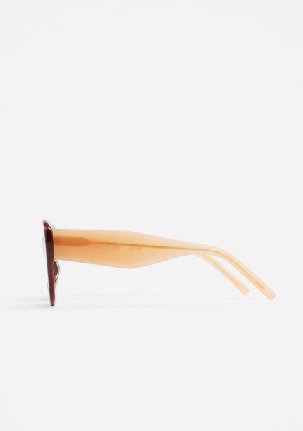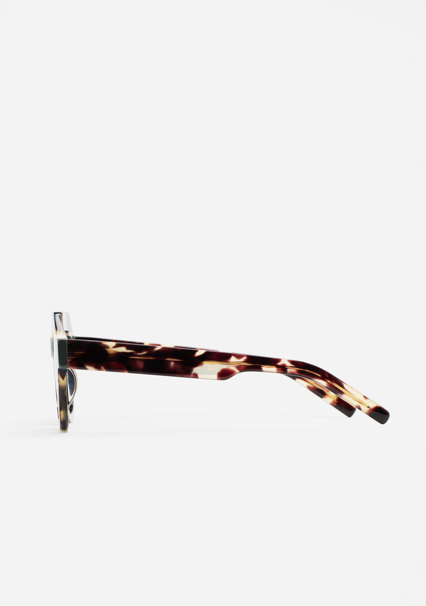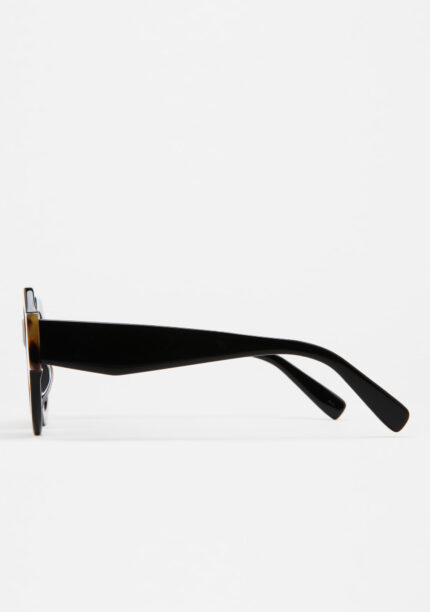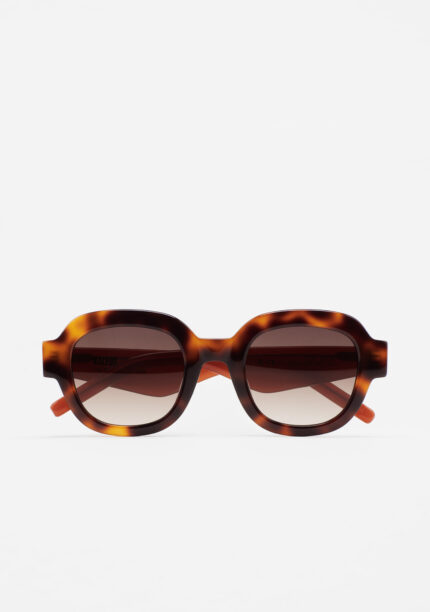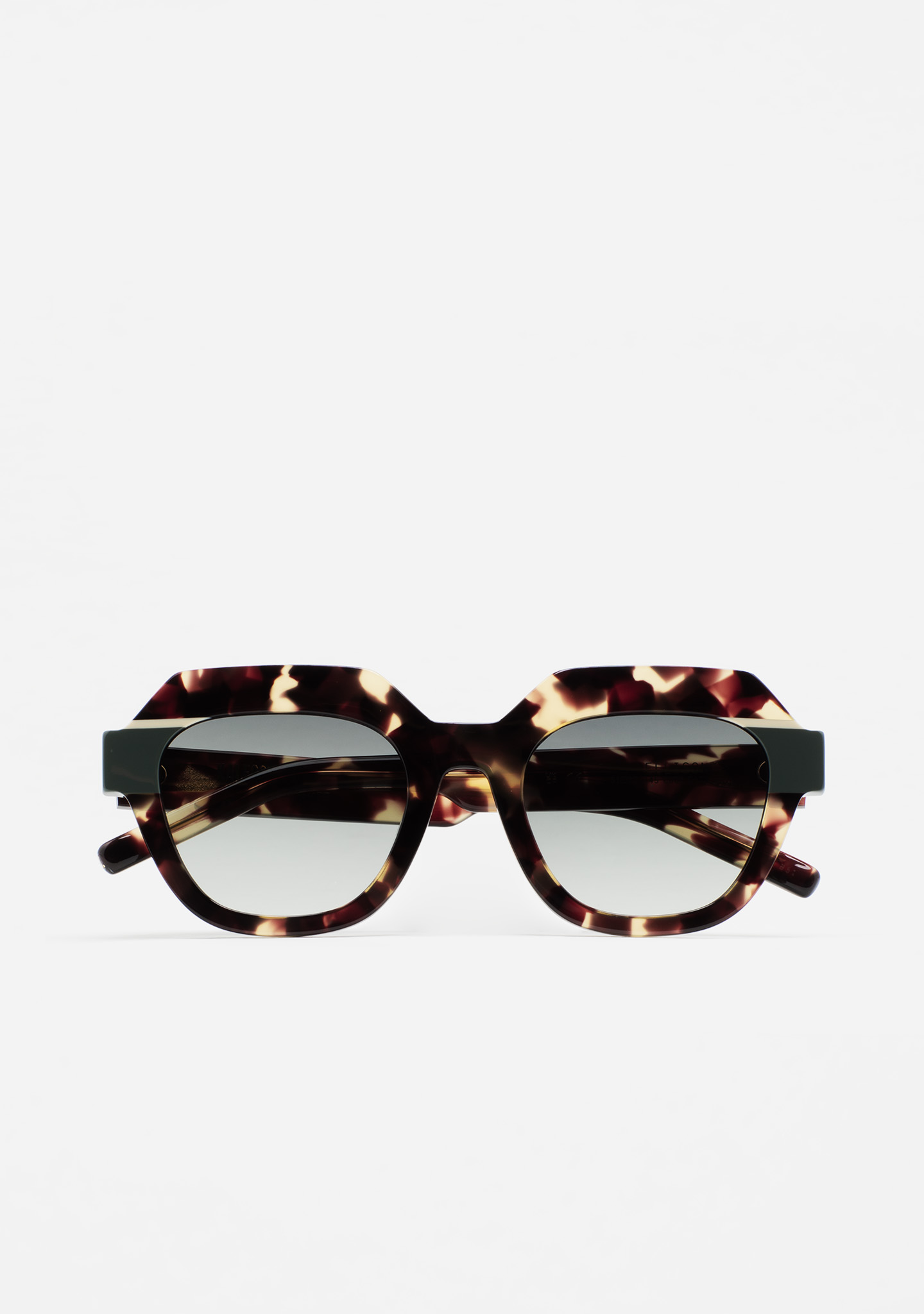 Modelo ELLISON. Gafa de sol de forma hexagonal. Frontal de acetato havana marrón vintage con doble laminado blanco y verde. Varillas de acetato havana marrón vintage. Lente verde degradada base 2 con 100% protección UV y tratamiento antirreflejante. Lente Categoría 2. Plaquetas de acetato incorporadas. Hecha a mano