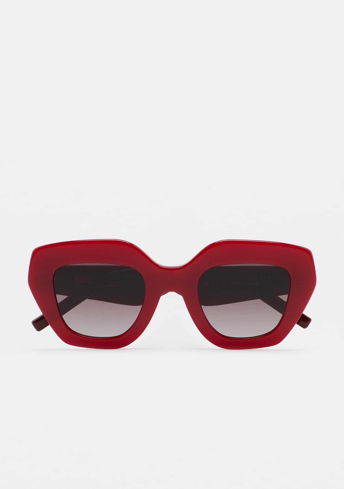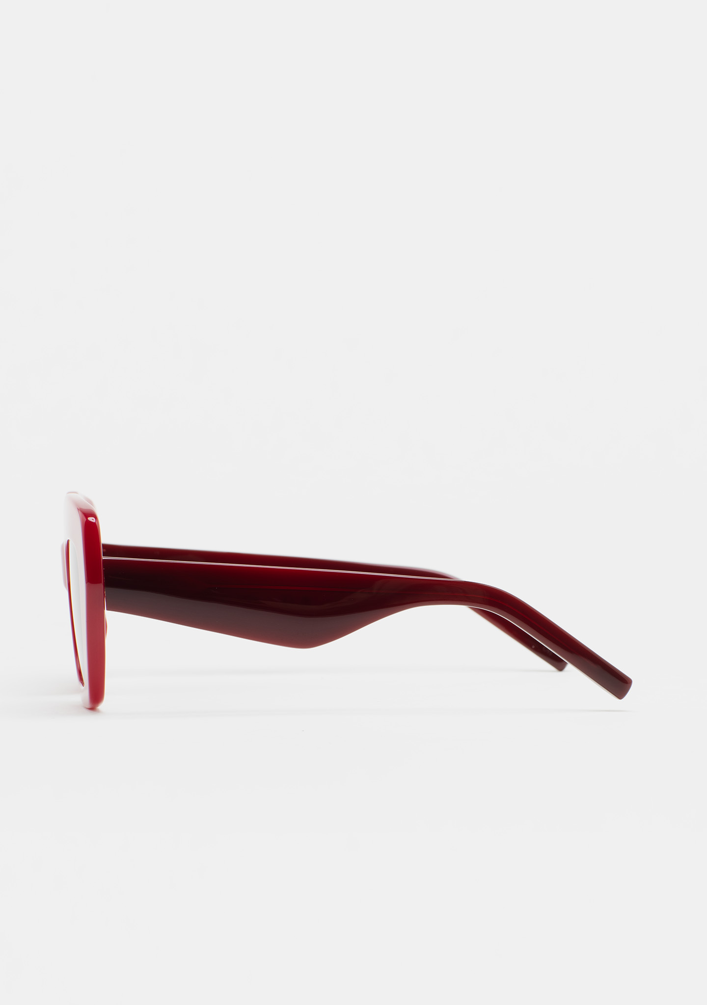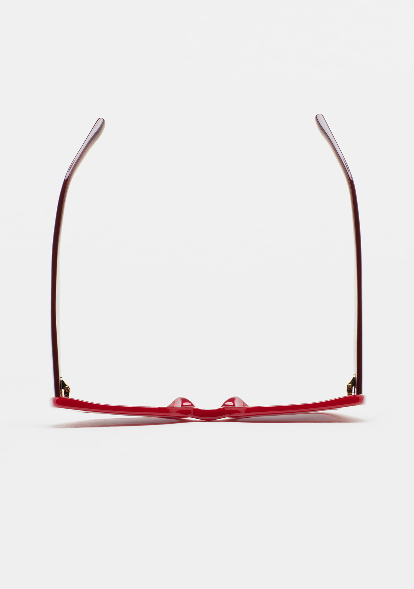 Modelo HALSEY. Gafa de sol de forma mariposa. Frontal de acetato rojo y varillas de acetato burdeos translúcido. Lente gris degradada base 2 con 100% protección UV y tratamiento antirreflejante. Lente Categoría 3. Plaquetas de acetato incorporadas. Hecha a mano.