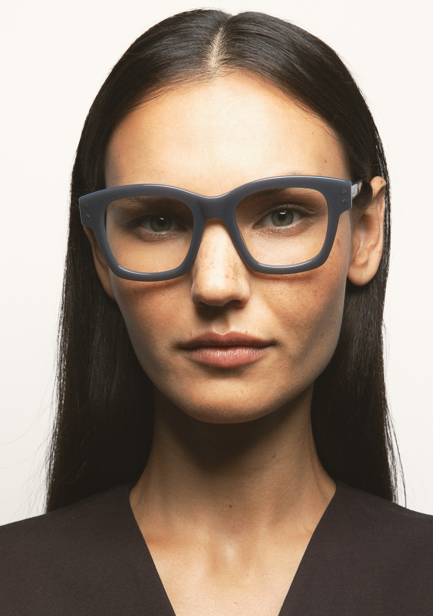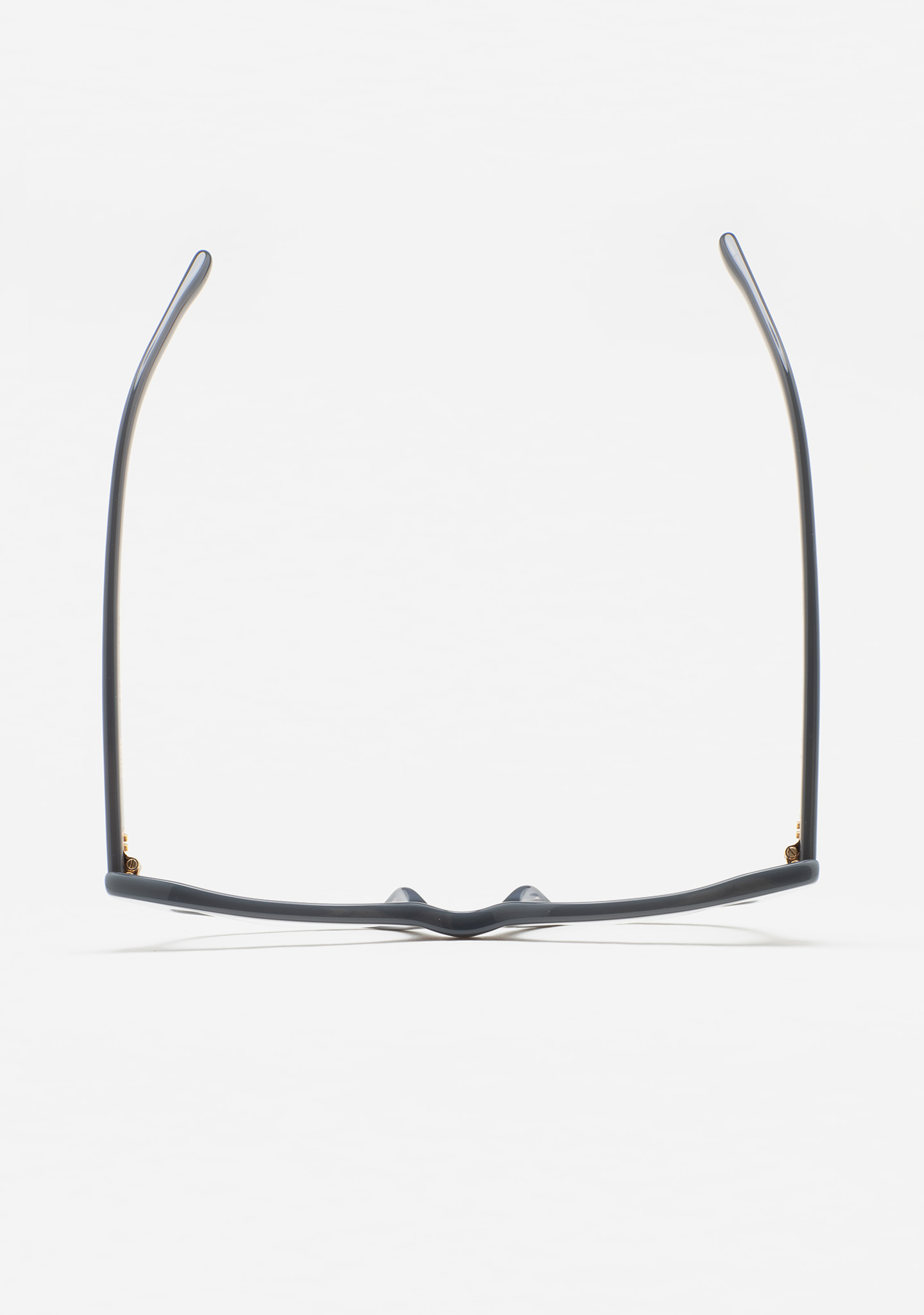Modelo PARK. Gafa de  ver de forma cuadrada. Frontal y varillas de acetato gris translúcido. Bisagras con remaches oro en codo y varillas. Plaquetas de acetato incorporadas. Hecha a mano.