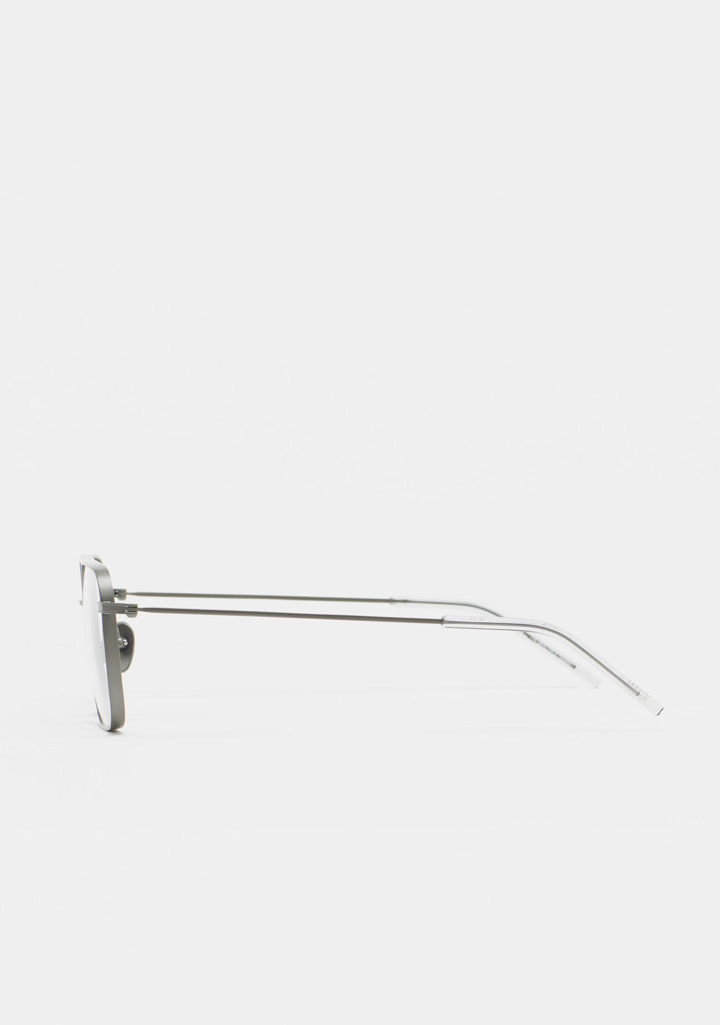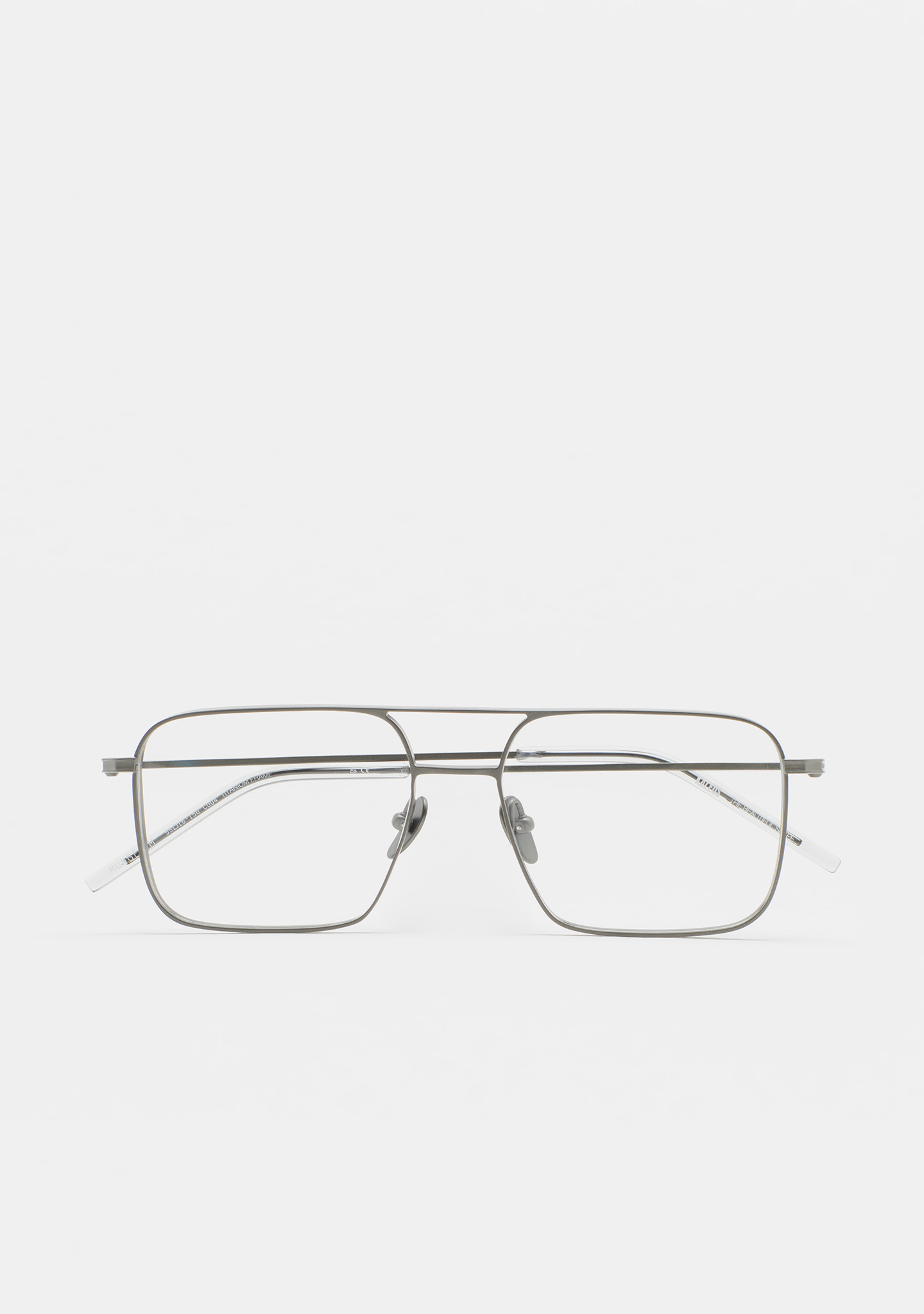 Modelo MUNGER M. Gafa de ver de forma rectangular con doble puente. Frontal y varillas de titanio verde. Varillas con terminal de acetato gris transparente. Plaquetas incorporadas. Hecha a mano. Gafa disponible en dos tamaños: mediana (M) y grande (L).