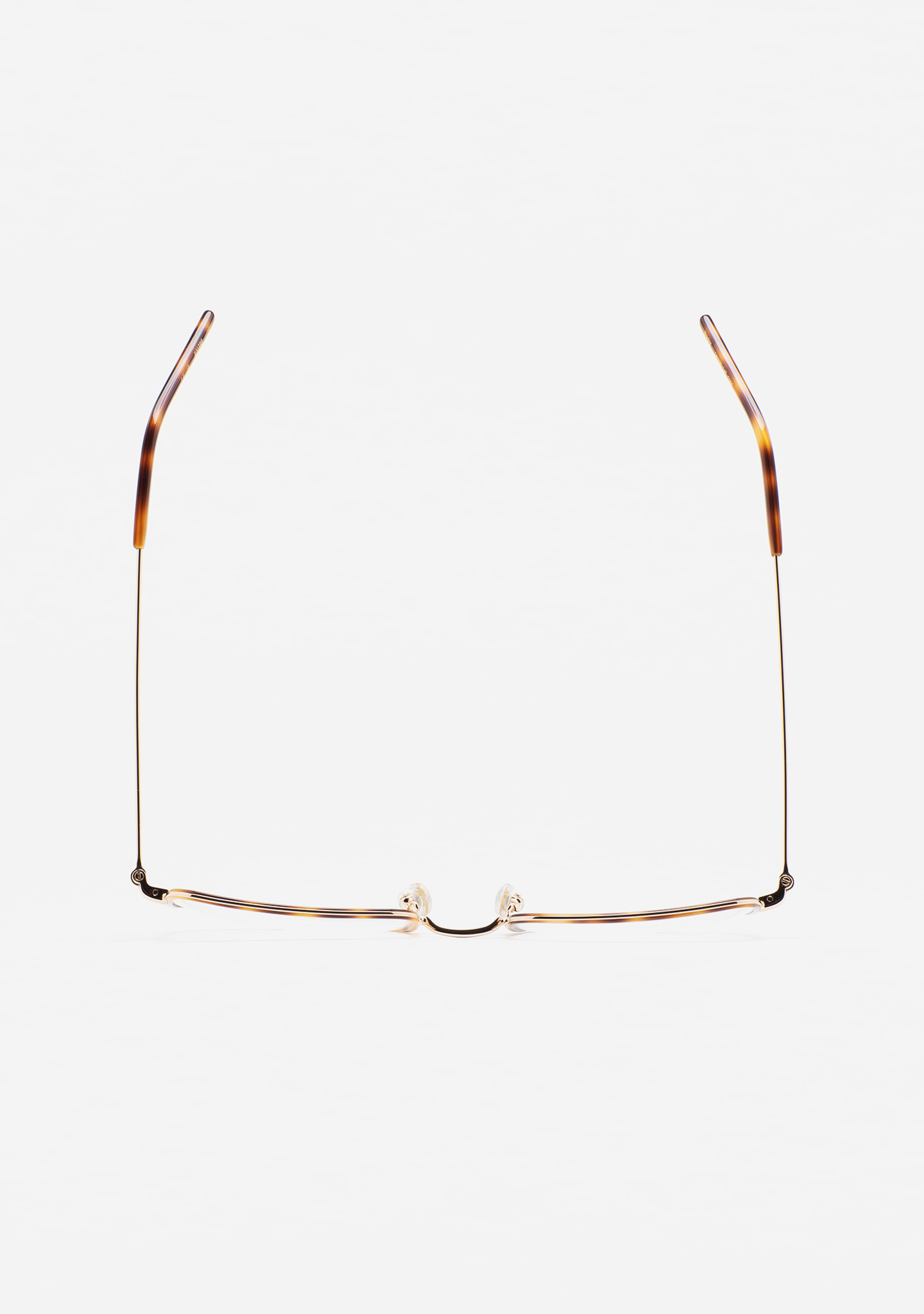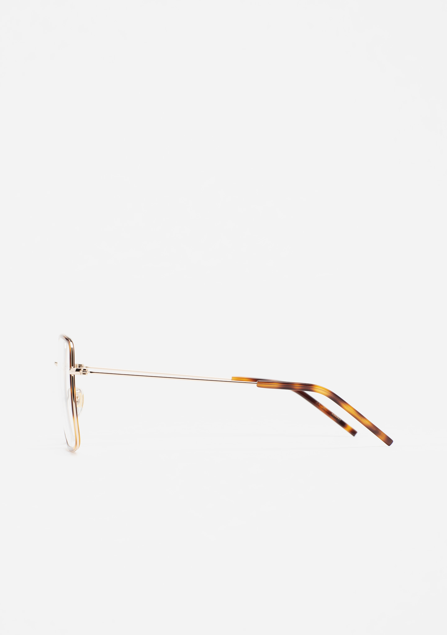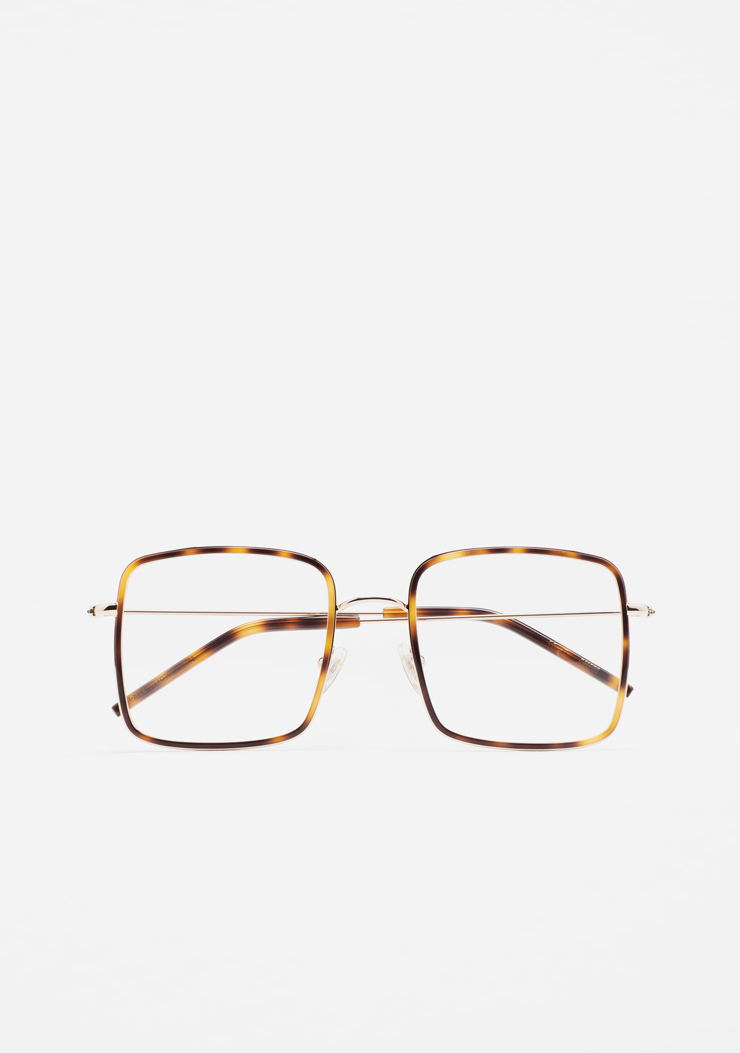 Modelo PARK. Gafa de ver de forma cuadrada. Frontal de estructura de acero inoxidable rosa dorado con cerquillo por dentro de la estructura de acetato high density havana marrón. Puente y varillas de acero inoxidable rosa dorado. Varillas con terminal de acetato havana marrón. Plaquetas de acetato incorporadas. Hecha a mano.
