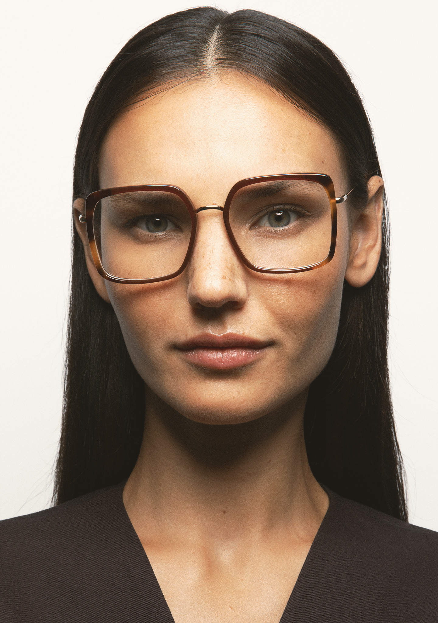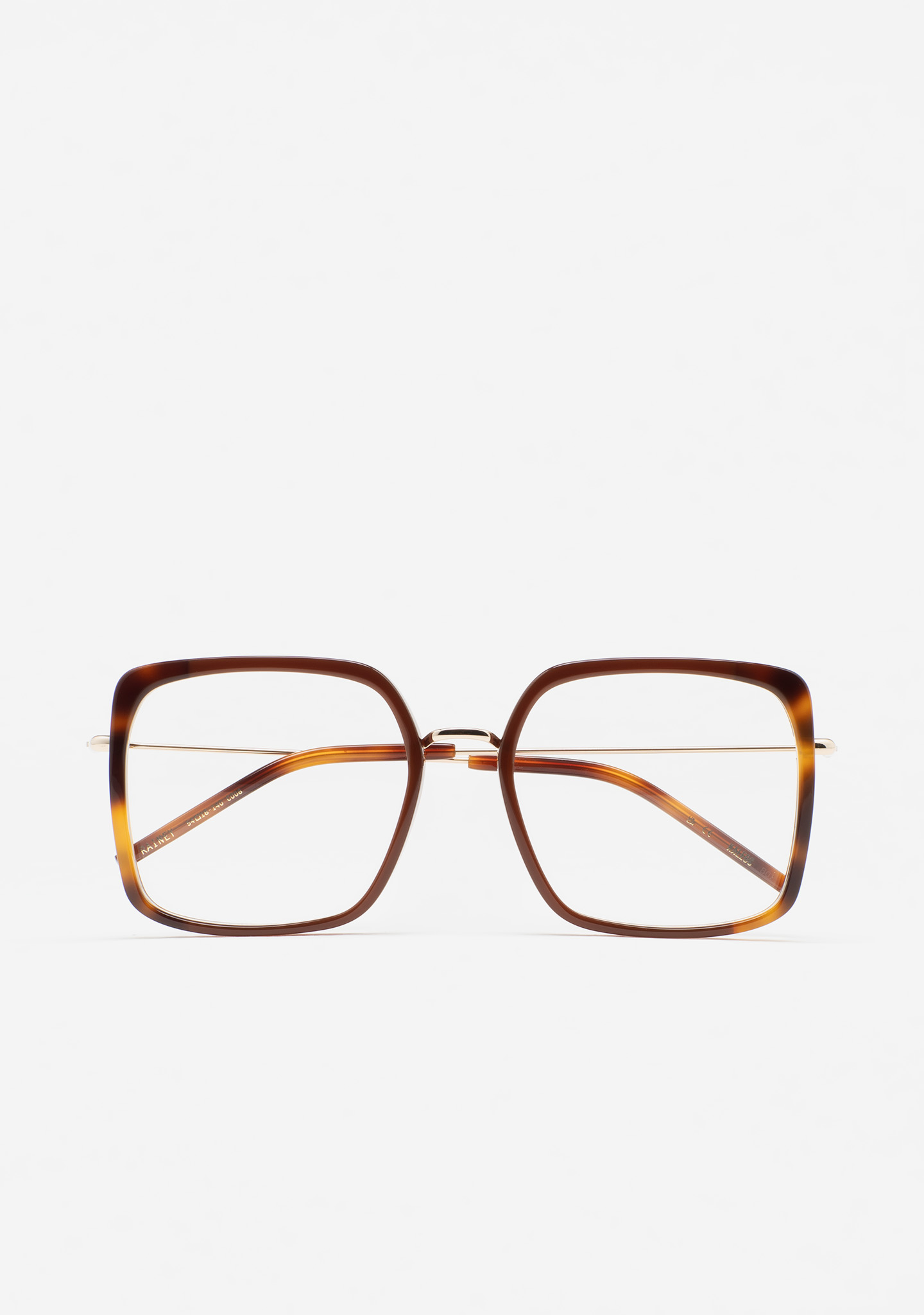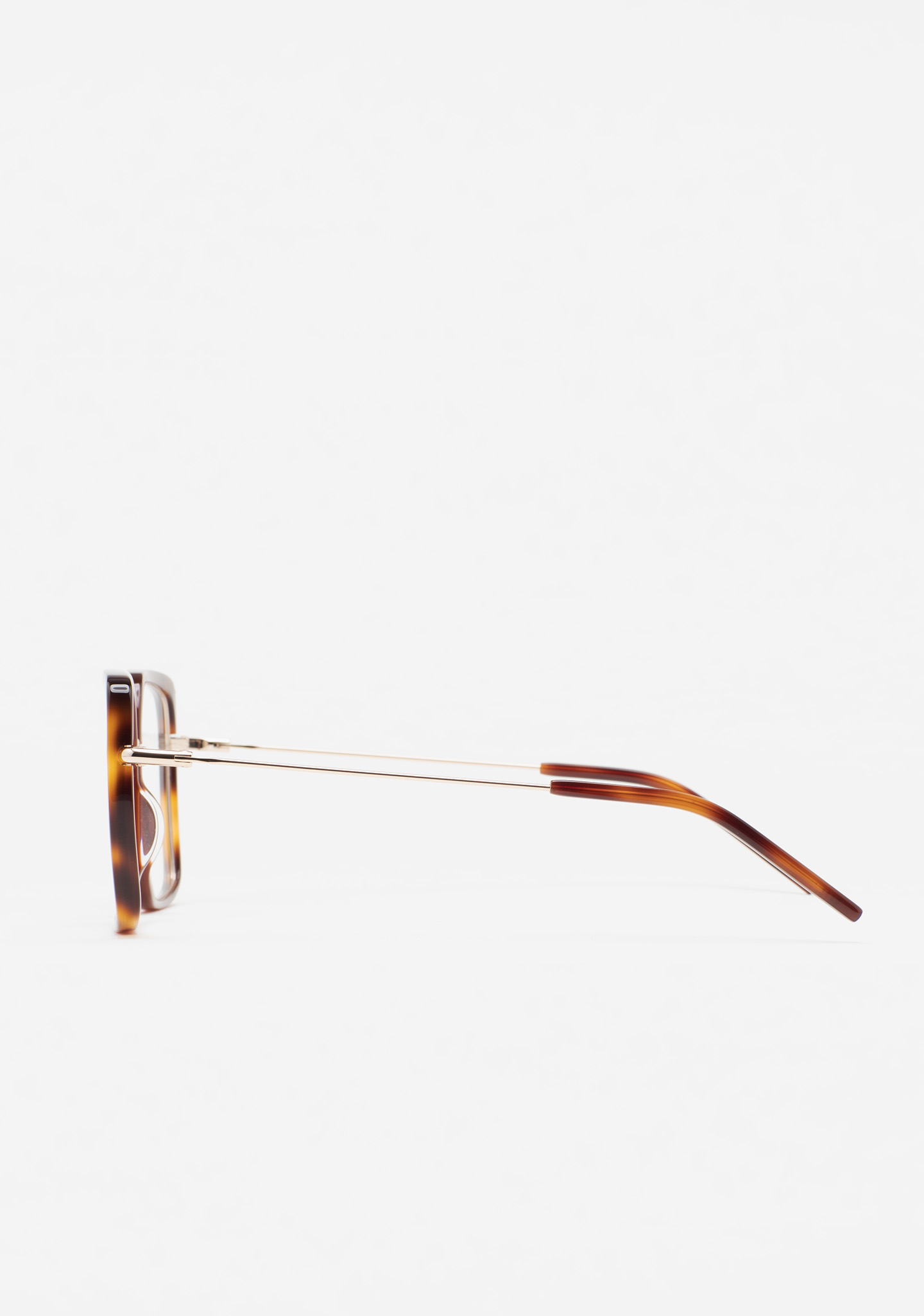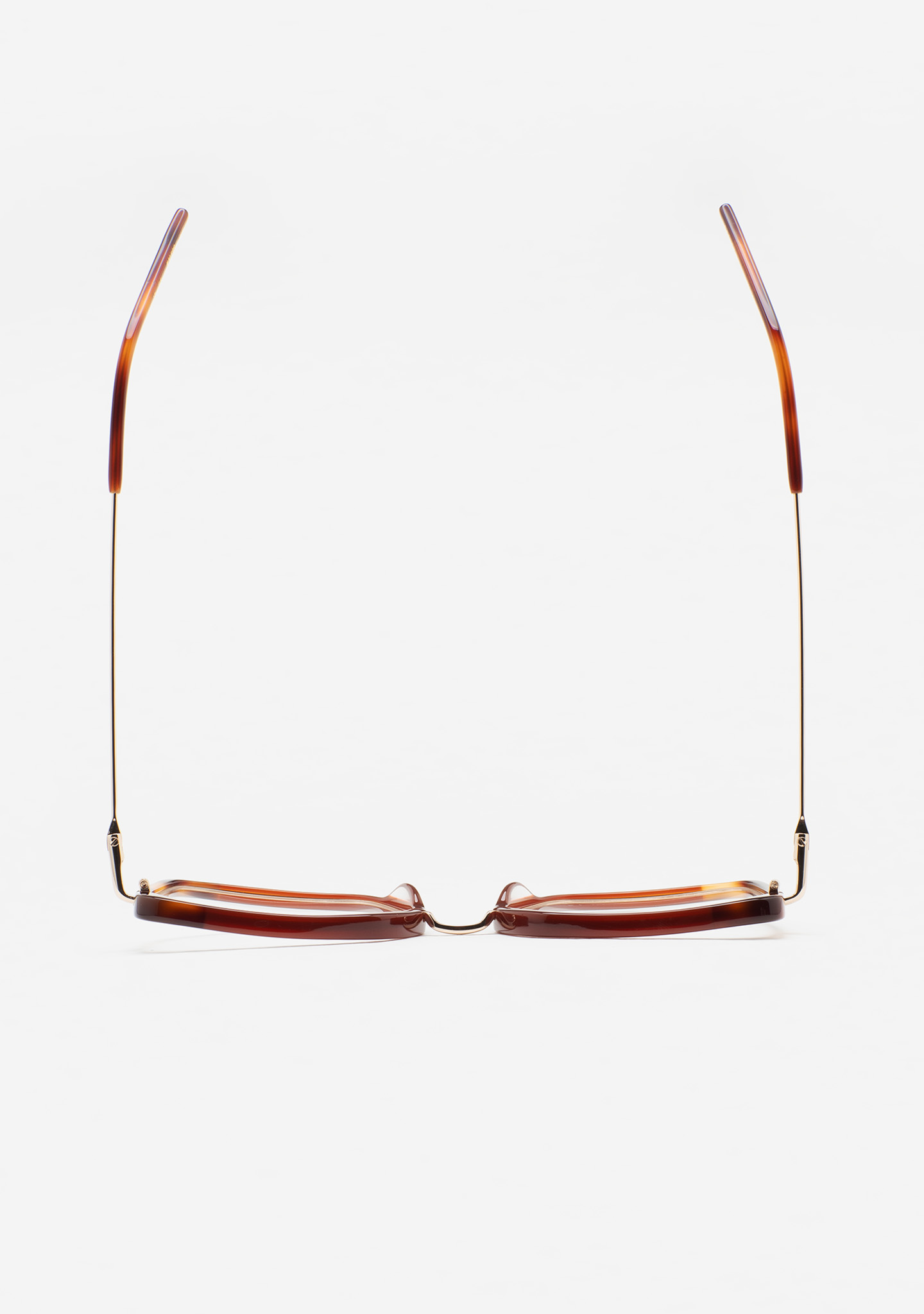 Modelo RAINEY. Gafa de ver de forma cuadrada. Frontal de acetato marrón translúcido con laminado havana marrón. Puente y varillas de acero inoxidable dorado. Varillas con terminal de acetato havana marrón. Plaquetas de acetato incorporadas. Hecha a mano.