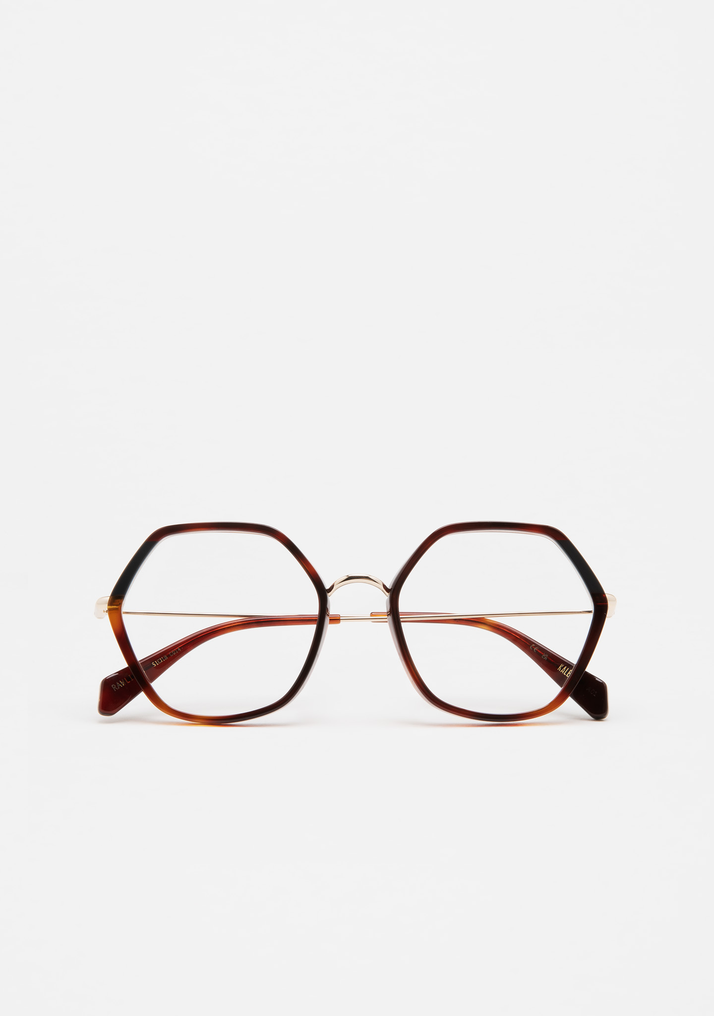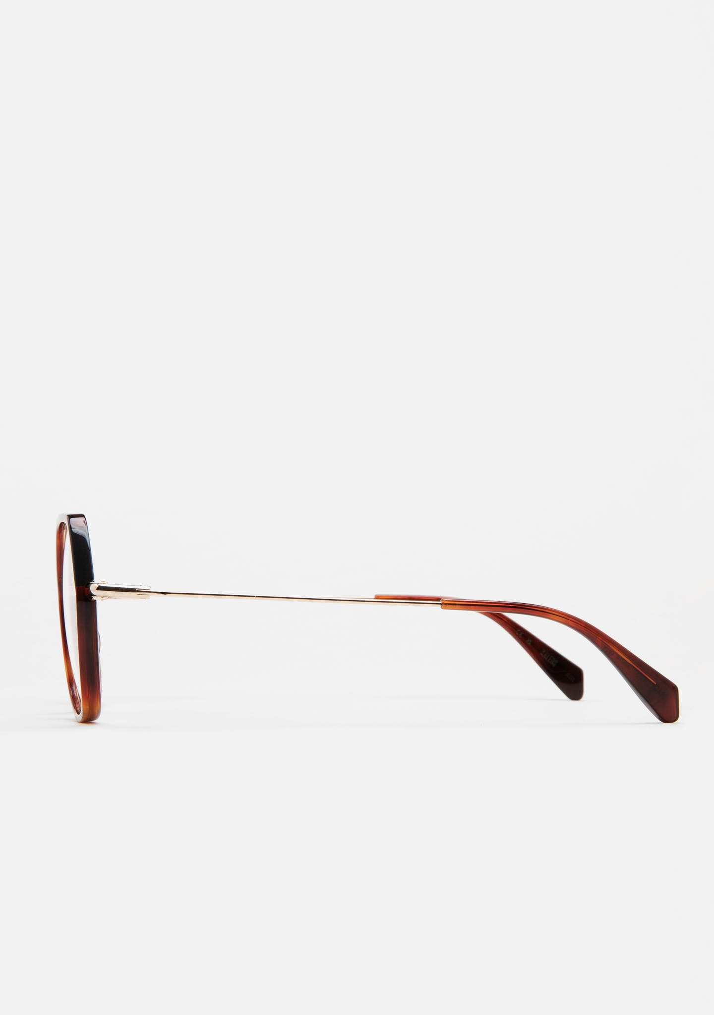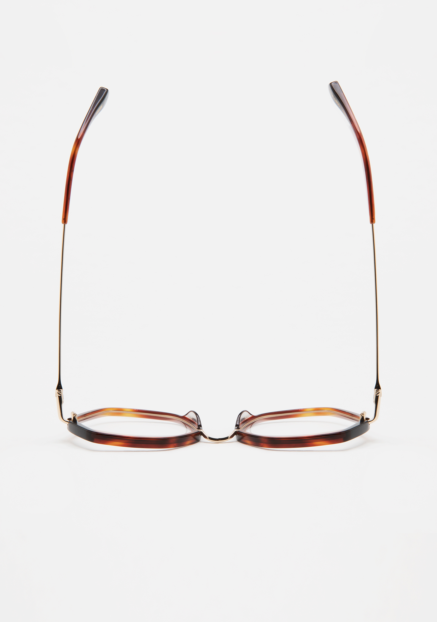 Modelo RAWLINGS. Gafa de ver de forma de forma hexagonal con estructura y puente de acero inoxidable dorado. Frontal de acetato havana marrón rojo con laminado gris opaco. Varillas de acero inoxidable con terminal de acetato havana marrón rojo. Plaquetas de acetato incorporadas. Hecha a mano.