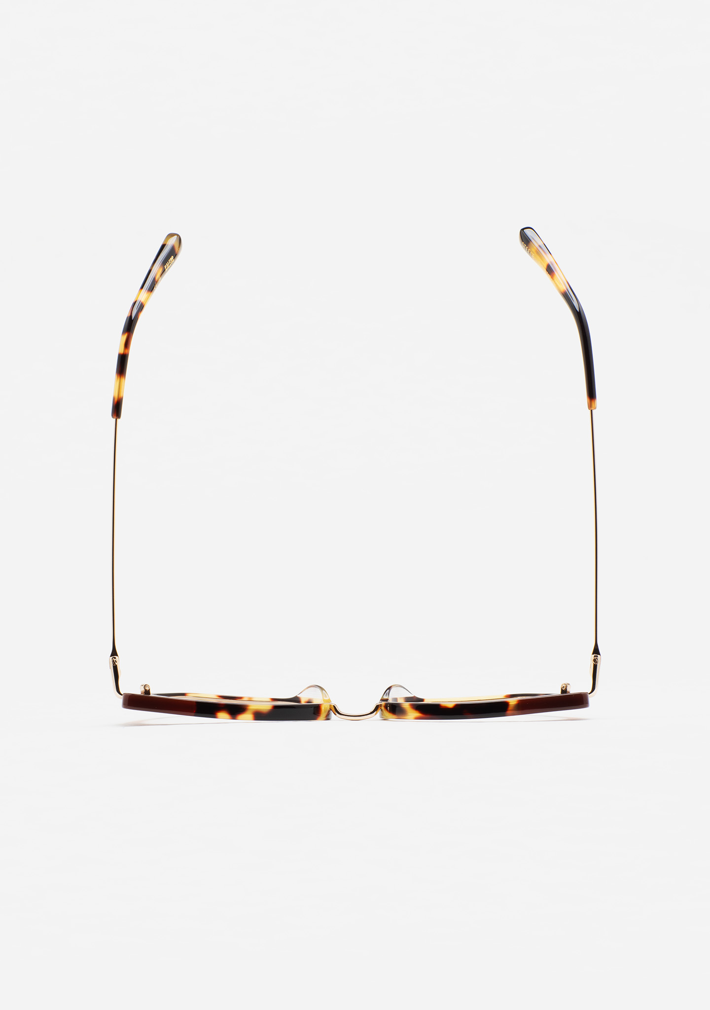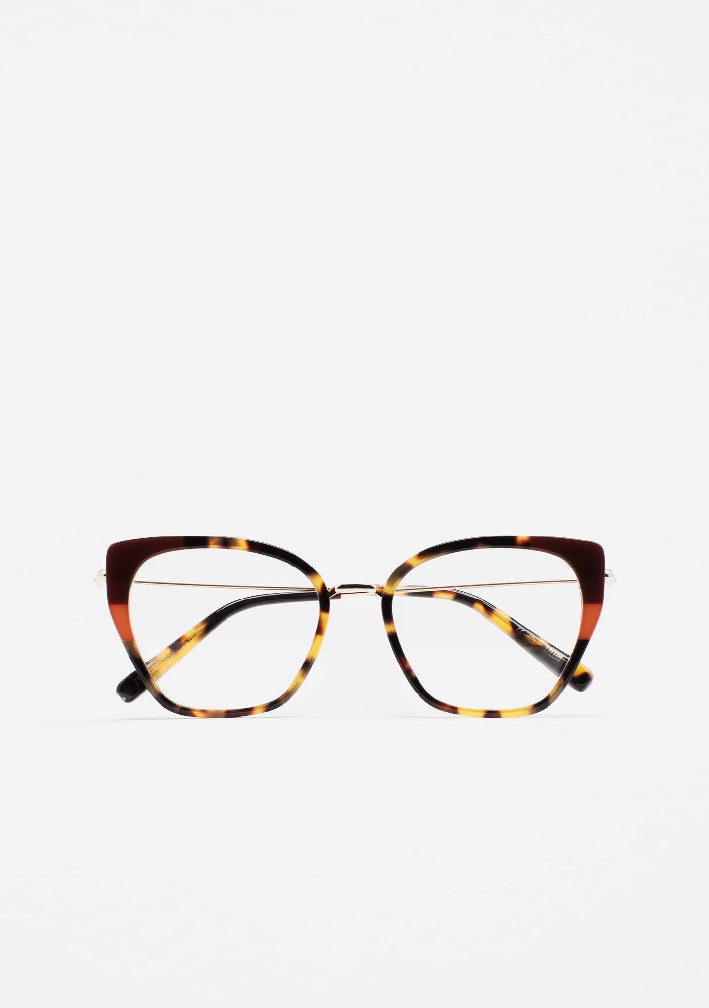 Modelo STEELE. Gafa de ver de acetato havana marrón vintage con doble laminado naranja y marrón. Puente dorado de acero inoxidable. Forma de mariposa. Varillas de acero inoxidable con terminal de acetato. Plaquetas de acetato incorporadas. Hecha a mano.