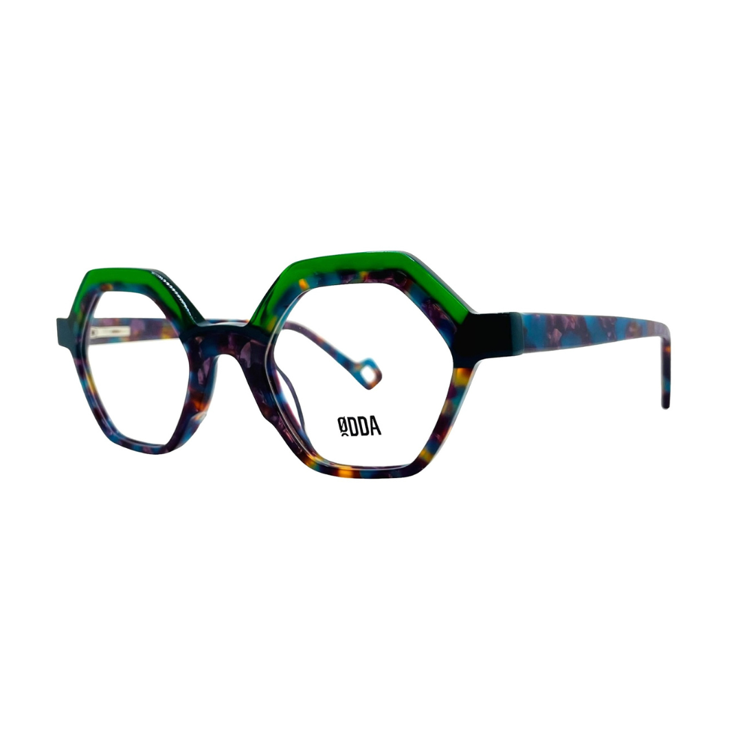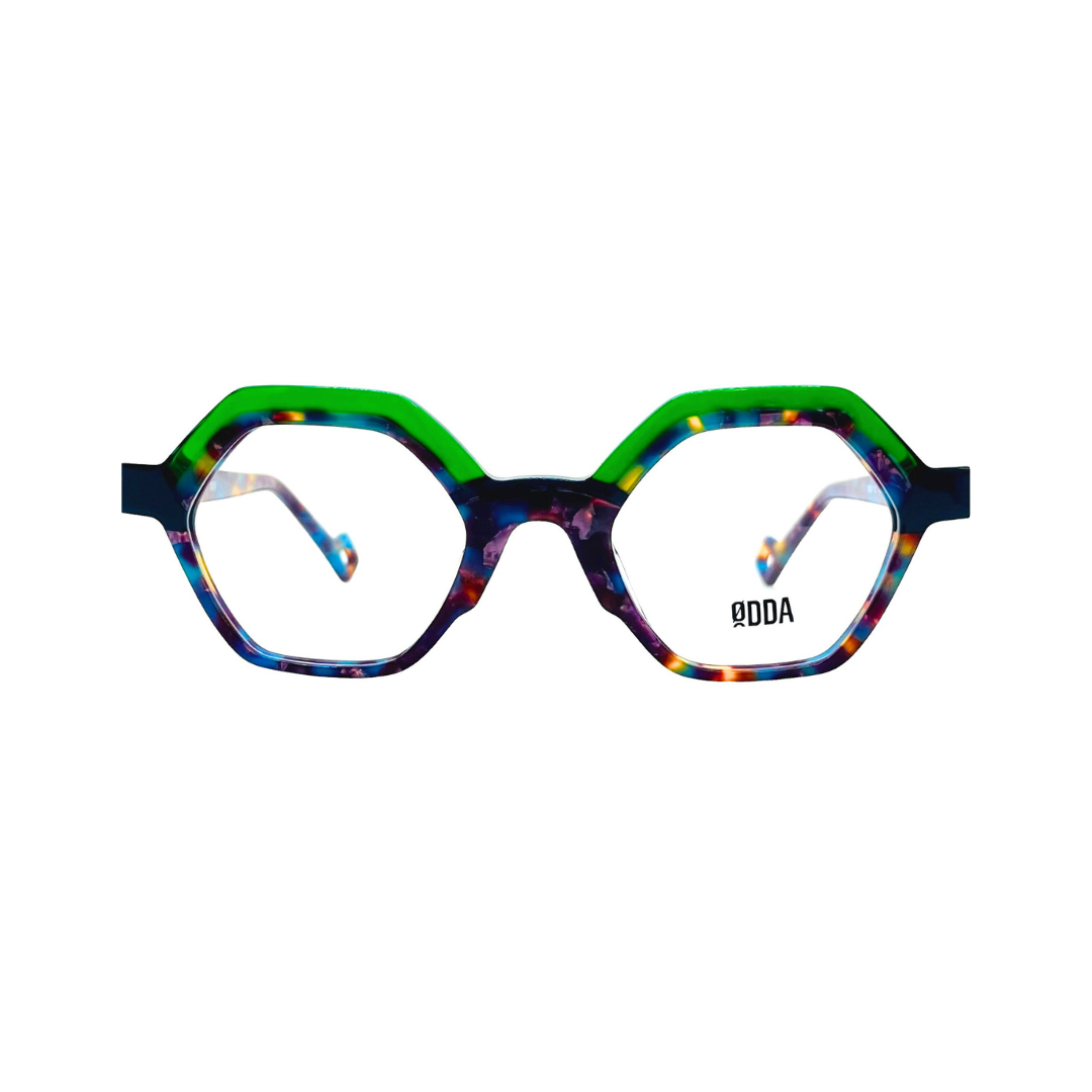 Gafa de vista de marca ØDDA, modelo 5927. Gafa de vista hexagonal, de acetato en color verde, azul y violeta combinado.